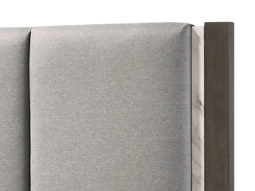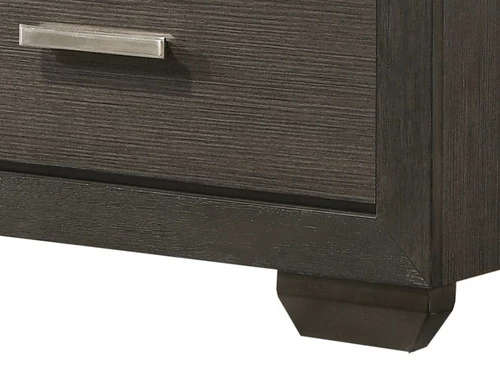 The Alana Bedroom Collection offers a linear padded headboard with chromed trim, along with faux Marmol case good tops, adorned with two different drawer handle styles to provide a special style for this bedroom set.