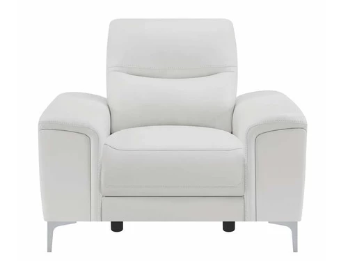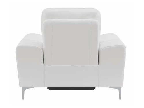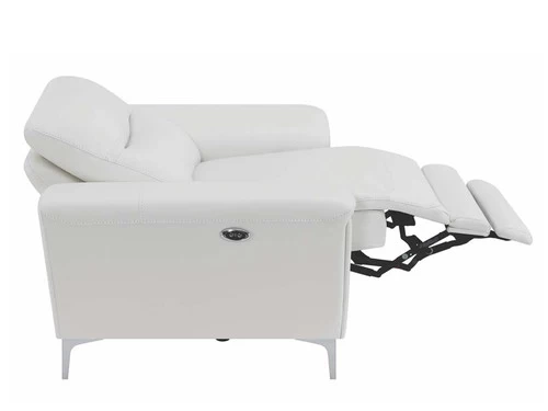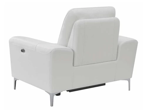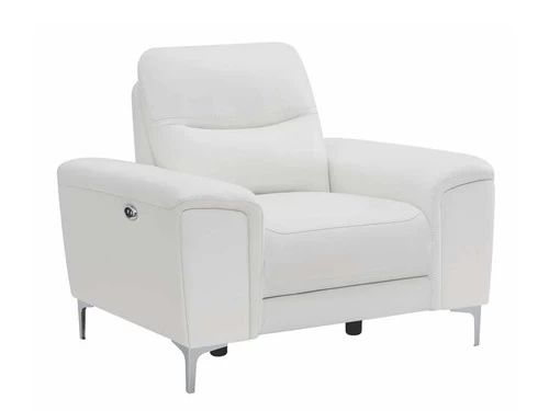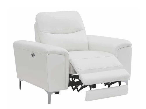 Complete your living room’s lounge space in style with this gorgeous, leather match power recliner. Also available in blue. Its plush, padded seat is enhanced by a Certi Pur certified memory foam topper for added comfort. Its sleek, metal legs are finished in polished stainless steel for a brilliant touch of shine. This contemporary recliner comes complete with a built in USB port for your convenience.