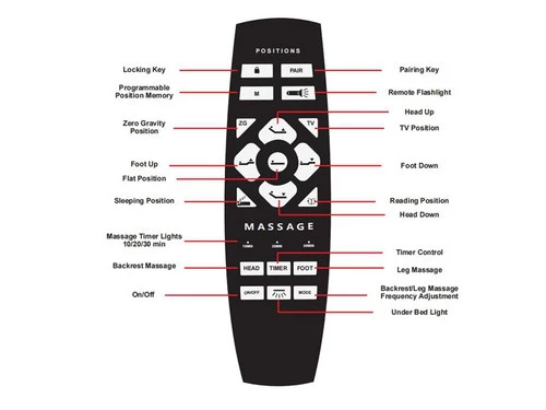 The Allen adjustable base comes with USB charging outlets 2 on each side, a total of 4 ports, and different convenient buttons: Under Bed Light, Pairing (Use for 2 Twin XL as a King) Locking Key, Remote Flashlight, Reading Position, Sleeping Position, Head & Foot Up and Down, Programmable Position Memory, TV Position, Flat Position, Massage Timer Lights, Backrest Massage, Dual Massage (Head & Foot) with Frequency Adjustment and Timer, Zero Gravity Position and Anti Snore Position. This adjustable base will bring all the support and comfort you need to get a perfect rest. Adjustable Legs.