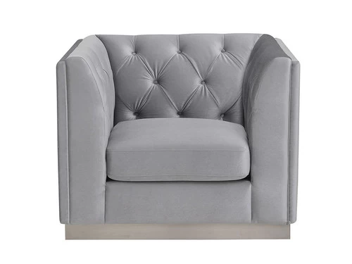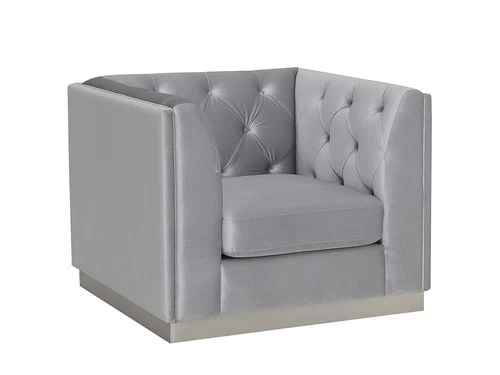 This modern style of chair has padding on the outer arms and backs of the chair. This allows you to float the pieces in an open plan room. Button quilting on the arm panels, inside arms and back adds style and comfort for an oh-so-modern look. The velvet fabric has that soft and smooth feel and comfort that adds to the beautiful design. This chair will dress any room and give it that special touch of elegance.