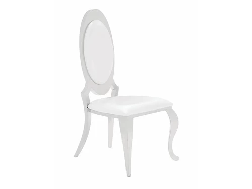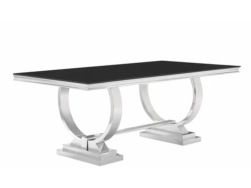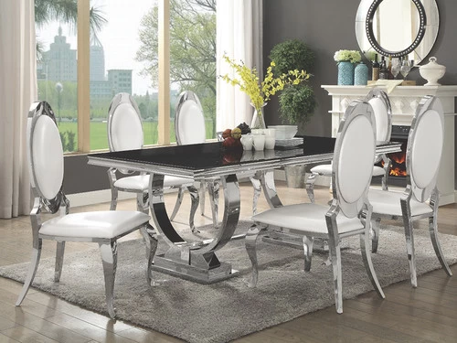 This dining set has a unique design that’s an ideal complement to a contemporary style home. The Antoine dining collection features polished chrome table base with an art-deco flair, black tempered glass with a beveled edge. Silver legs are fashioned in a ring-like circular design atop two silver tiered bases. The oval backrest of the spectacular “Alice in Wonderland” chair design will make a well-deserved statement of luxury. Enjoy years of everyday use with this modern yet timeless design.