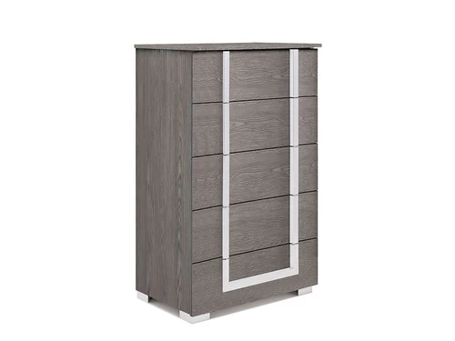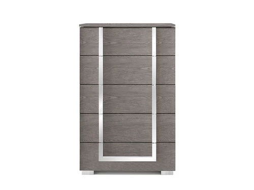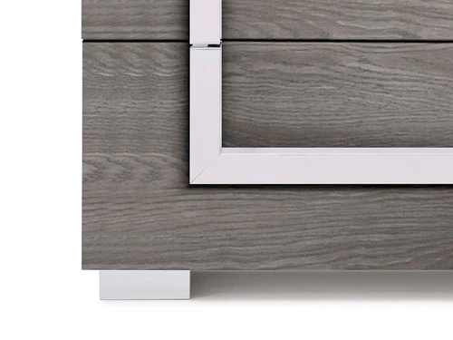 The Antonella Chest offers a sleek, luxury atmosphere to your bedroom, showcasing matte accented by aluminum around the edges of the case goods, and unique, contemporary chrome handles.