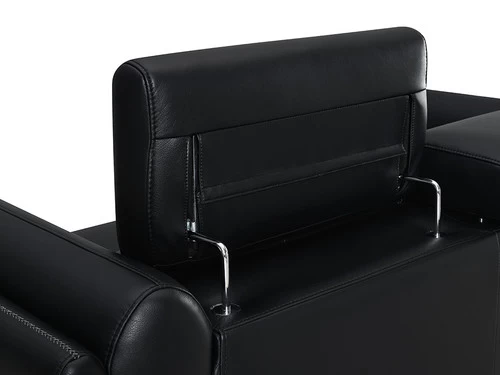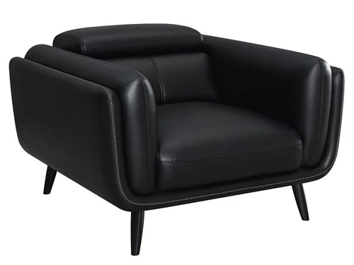 This elegant, retro-inspired modern chair is destined to bring a bold look to corners and seating areas. The tuxedo-inspired frame presents an extra plush padding of double track shelter arms, a tall back and attached seat cushion. Upholstered entirely in a smooth black leatherette with contrast cross-stitching and top stitching details, this charming chair makes itself at home in stylish entertainment rooms and beyond. Flared legs bring out the vintage elements and lend a mid-century modern hat tip. An impressive addition to entertainment rooms and more.