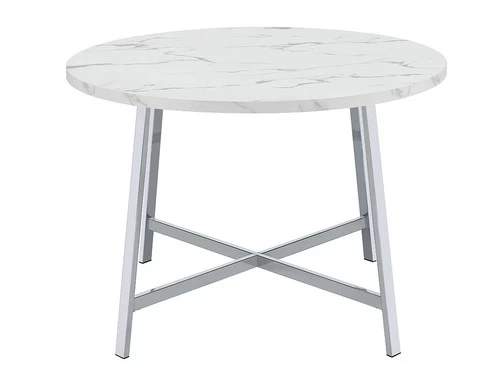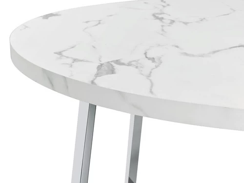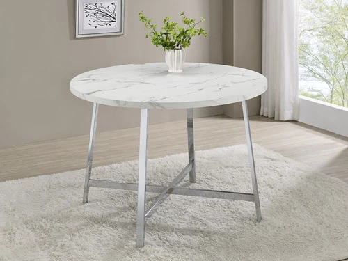 Indulge in the retro charm of mid-century modern design with this stunning faux Carrara marble dining table. The sleek, circular shape and its eye-catching chrome metal base make it an instant showstopper.