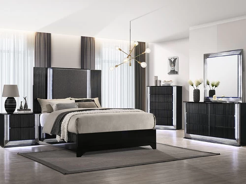 Elegant styling and a sleek exciting design are the details of the Aspen Colletion. The Bed is Black with complementary ridge trim detail, which together create a smart and sophisticated look that will enhance many room settings/decor choices. Tapered panel style legs that continue the versatile and delightful visual aesthetic of this bed. LED Lighting on every piece makes your inner sanctum like none other. A gentle push on the fluted, black lacquer fronts opens the generous storage drawers without the need for traditional pulls. This colletion is the perfect choice to update your bedroom and create a sanctuary of comfortable and inviting relaxation for your home for years to come.