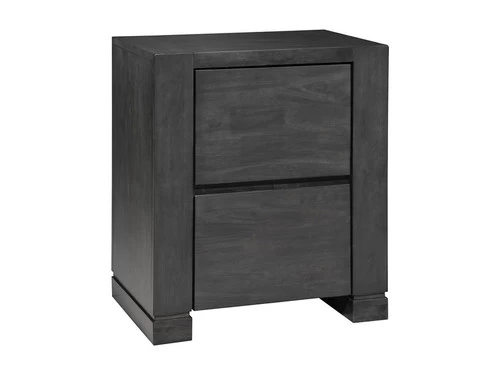 Embrace a clean linear look of simplicity by completing a bedroom space with this three-piece bedroom set. Constructed of sustainable hardwood from rubberwood plantation lumber, this set reflects a trending commitment to eco-friendly living. Bring a cool dark gray finish into a room for versatility and style. Anchored by a grand bed attached to a high headboard and upgraded with paneled sections, this set delivers a sophisticated aura. The set includes a bed, a nightstand, and a dresser.