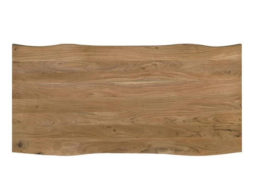 Revitalize your dining room with the exquisite beauty of this contemporary dining table. The solid acacia live edge table top boasts unique markings and stunning wood grain, adding a touch of natural charm. Contrasting with the sleek double pedestal black iron legs, this table is a captivating blend of rustic and modern styles. Make a statement with this striking centerpiece for unforgettable dining experiences.