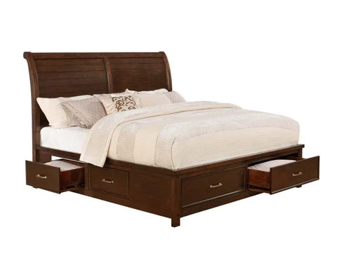 Barstow storage Bed is the perfect combination of rustic style and transitional design. Pecan finish adds character, and panelled sleigh bed with 6 roomy storage drawers, for extra comfort. Unique style that wont go understated in your home.