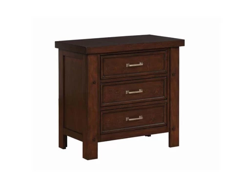 – Nightstand’s top drawer has dual USB charging ports for easy access.