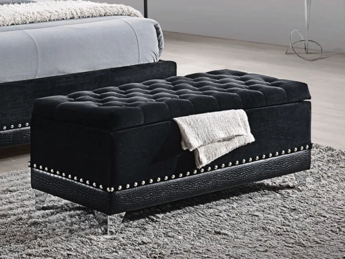 [object Object]Barzini Bench crafted black finish, upholstered in metallic velvet and crocodile leatherette. Individually hand placed nail head trim for an elegant look.