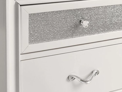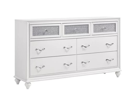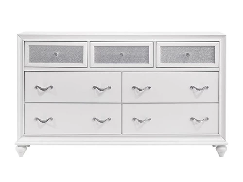 Inject some rock n’ roll glam into your bedroom with Barzini Dresser. The pieces are constructed of Asian hardwood and veneers in a bold, white finish. This finish is paired with a unique and elegant metallic adorning the Dresser .