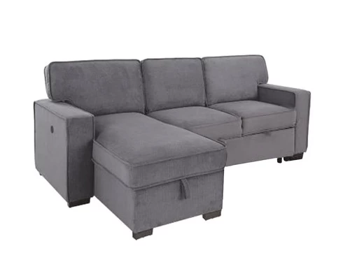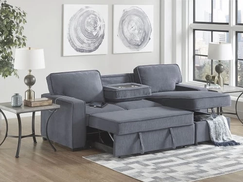 As practical as it is refreshingly modern, the Belen Sleeper Sectional. This L-shaped section features cushions to give you the best in comfort and support. The sofa on the side unfolds in the bed for your guests, and the other side rises to reveal storage for bedding and pillows, which makes it a very useful piece of furniture. This Sofa features a drop-down table with cup holders. This sectional can be assemble right or left according to your preference.