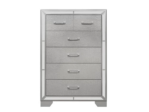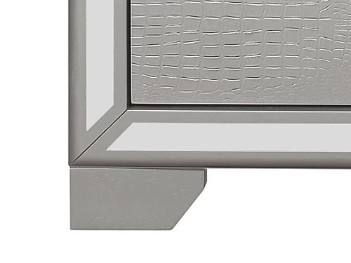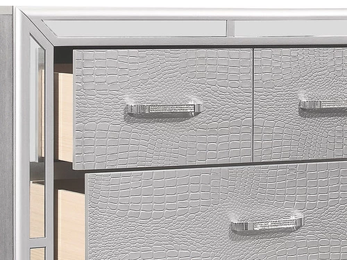 Elegant touches abound with the design of the Aveline Chest. Alligator embossed veneer covers the collectionr, an elegant palette that beautifully pairs with your bedroom’s accessories and bedding. Each piece of the collection is framed with mirror trim, while the drawers are fronted with chrome-finished faux-diamond inlay bar hardware, each accent a perfect decorative touch to reflect your glamorous style.