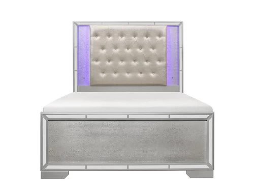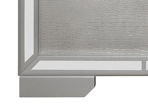 Elegant touches abound with the design of the Belfast Collection. Alligator embossed veneer covers the collection and is finished in silver, an elegant palette that beautifully pairs with your bedroom’s accessories and bedding. The headboard is centered with a silver faux leather panel that features button tufting and LED backlighting. Each piece of the collection is framed with mirror trim, each accent a perfect decorative touch to reflect your glamorous style.
