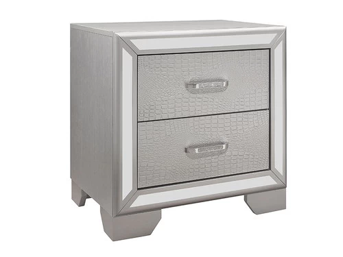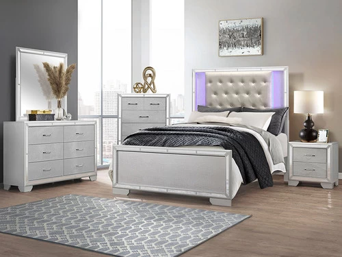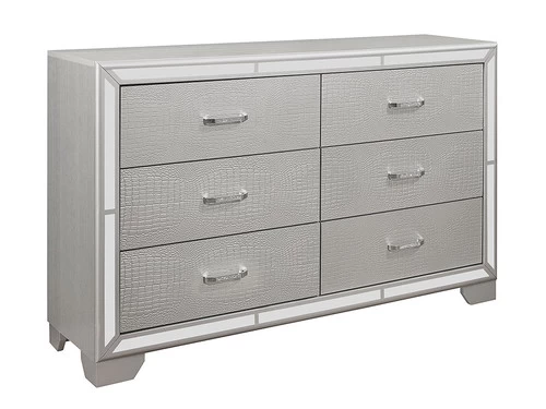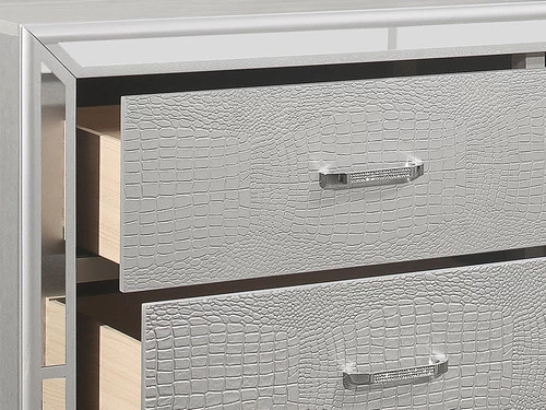 Elegant touches abound with the design of the Belfast Collection. Alligator embossed veneer covers the collection and is finished in silver, an elegant palette that beautifully pairs with your bedroom’s accessories and bedding. The headboard is centered with a silver faux leather panel that features button tufting and LED backlighting. Each piece of the collection is framed with mirror trim, while the drawers are fronted with chrome-finished faux-diamond inlay bar hardware, each accent a perfect decorative touch to reflect your glamorous style.