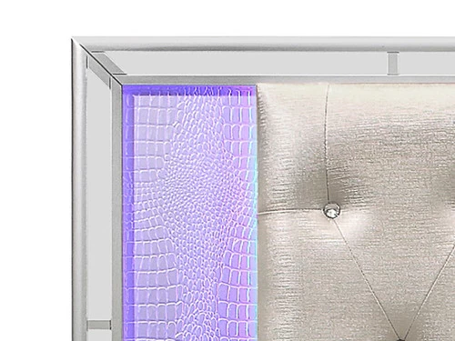 Elegant touches abound with the design of the Belfast Collection. Alligator embossed veneer covers the collection and is finished in silver, an elegant palette that beautifully pairs with your bedroom’s accessories and bedding. The headboard is centered with a silver faux leather panel that features button tufting and LED backlighting. Each piece of the collection is framed with mirror trim, each accent a perfect decorative touch to reflect your glamorous style.