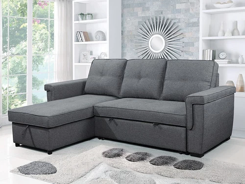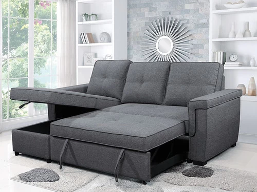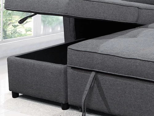 As practical as it is refreshingly modern, the Brody Sleeper Sectional. This L-shaped section features cushions to give you the best in comfort and support. The sofa on the left side unfolds in the bed for your guests, and the chaise on the right side rises to reveal storage for bedding and pillows, which makes it a very useful piece of furniture.