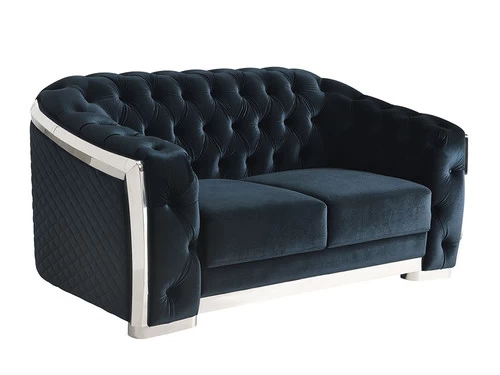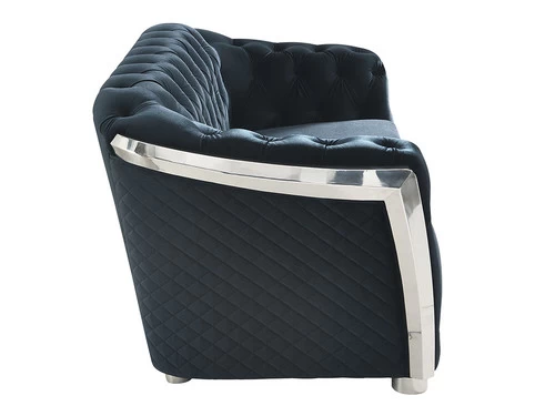 High style meets modern day living. Take notice of the quilting on the outside arms and backs of the chair. This allows you to float the piece in an open floor plan room. The button tufting on the arm panels, inside arms and backs adds style and comfort for such a modern look. The velvet fabric has that smooth and soft feel and comfort which adds to the beautiful design. The curved chrome outside framing is the final touch in this beautiful execution high style modern design.
