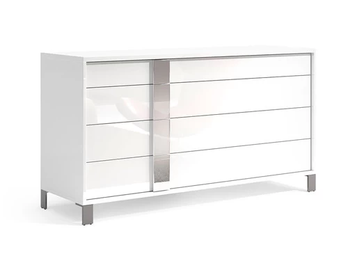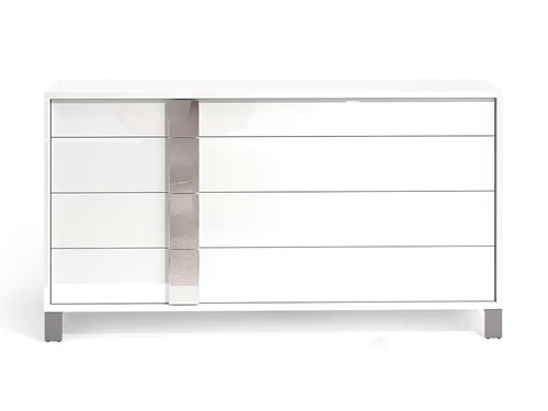 The Emma Dresser in Italian high gloss lacquer over a frosted ash wood finish, adorned with mirrored handles. Chrome feet elevate this dresser onto yet another level, although the wood finish keeps it clean and balanced.