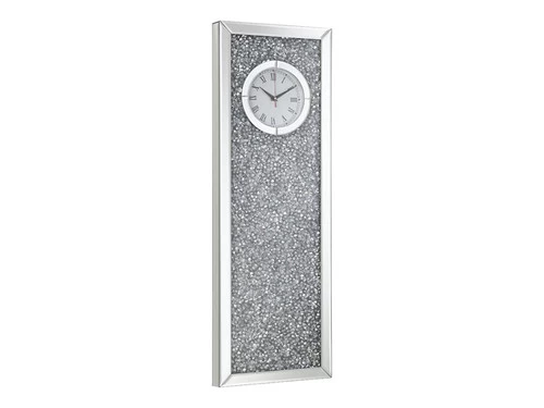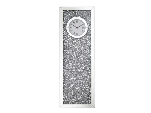Never lose track of time again when this shining crystal enveloped square time piece shimmers in the corner of your eye. Framed within beveled mirror panels and gray crystals. Sleek black hands in the round white frame. Adorn your living room with this clock.