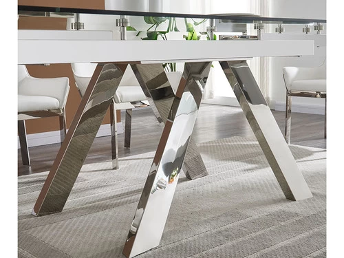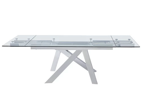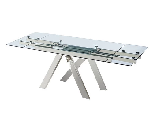 The Fuji Extendable Dining Table is a large and elegant dining room. The clear glass top features a polished stainless steel mechanism that allows the table to expand or contract depending on the size needed, with on wide legs with a crossed design in polished stainless steel. This beautiful dining room will allow you to invite friends and family to dinner.