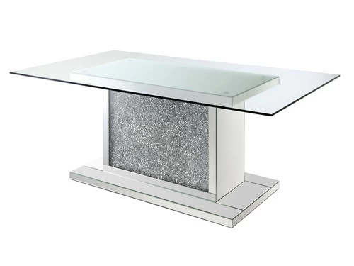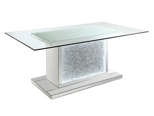 Delivering incomparable modern glam style to your dining room with this stunning glass dining table. A rectangular profile is spacious enough for the family, delivering a beautiful clear glass tabletop perfect for everything from daily dining to grand holidays. The star of this show is an incredible pedestal base that marries mirror trim and paneling with glittering faux diamond inlay sides that positively sparkle with sophistication. The table boasts built-in LED lighting, adding yet another dimension of elegance and ambiance. Infuse your home with stellar style and sophistication.