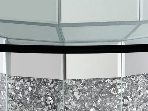 Host intimate celebrations at this modern glam dining table. A column-inspired pedestal frame scintillates and dazzles beneath a round, clear glass top table, showcasing it to your dinner guests. Sparkling faux diamonds create a spectacularly luxurious look and feel. Defining the edges is a gleaming mirror tile trim that creates a sophisticated, classy ambiance. Seat four to six guests comfortably at this spacious dining table.