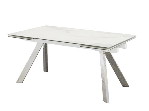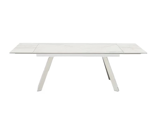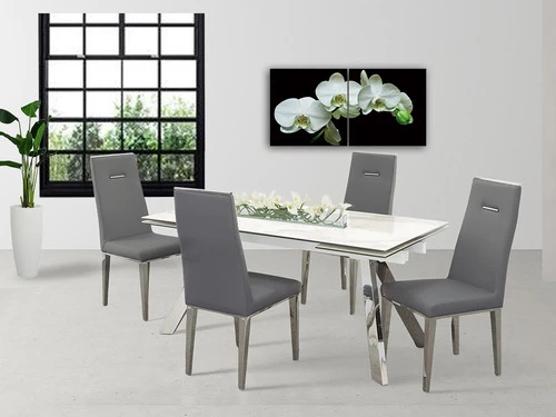 The Giselle dining set creates a refined statement in your dining room. The table feautures smooth white ceramic is placed over angled polished stainless steel legs, building a clean modern design for your home. You can seat up to a total of eight guests by using the two extension leaves.A Masterful Italian Design with comfort and Luxury in mind, developed for the American consumer, its padded all-around ergonomic seat and back and special details like the Stainless-steel polished accent on back and top of frame create an Iconic look for the most discerning of Tastes and décor.