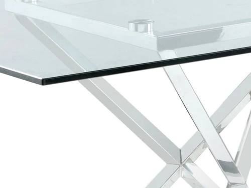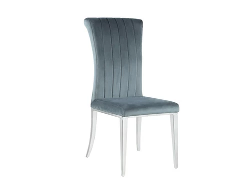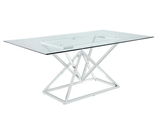 This glamorous five-piece dining set comes complete with a long table and four chairs.A stainless steel base is polished to a lustrous chrome finish, topped by a thick tempered glass tabletop with a timeless beveled edge.Each chair features a rolled back with channel tufting for an Art Deco vibe.In addition, each retro style chair is wrapped in a soft dark grey velvet with chrome finish legs that match the table base.Place this gorgeous table set in a contemporary dining room for an elegant dining experience.