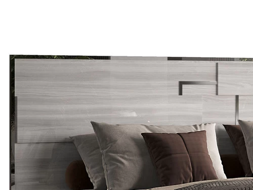 The Infinity Bed is the newest trend bed. The simplicity of the monochromatic glossy Gray color balance the visual movement created by the tiles placed on top of the front panels. The L-shaped metal has the same depth as the tiles and complements the check design with symmetric geometric forms that go left-right and top-bottom. Gray glossy color and stainless-steel finish are classic in modern design. The bedsides and footboard are assembled with cam-lock hardware that guarantees precision and sturdiness.