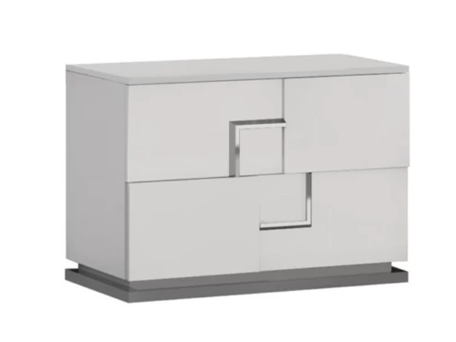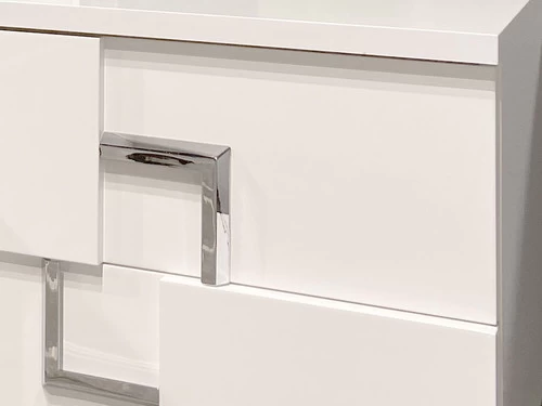 In the Infinity Nightstand, the simplicity of the monochromatic glossy white color balances the visual movement created by the tiles placed on top of the front panels. The L-shaped metal handles have the same depth as the tiles and complement the check design with symmetric geometric forms that go left-right and top-bottom. White glossy color and stainless-steel finish are classic in modern design. All drawers are equipped with high-quality, soft, self-closing, under-mount slides with stop safety feature to prevent a full extraction. The smooth and firm opening and closing movement of the drawers convey a sense of luxury. Drawers are completely lined with fabric-like material that is scratch and stain-resistant.