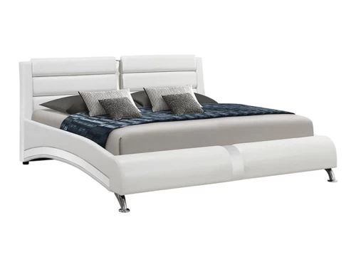 Show off your bold side with this greatly design upholstered bed. The elegant style incorporates straight and curved lines with chrome accented features that complement either the white upholstery. The padded headboard provides a place to place accent pillows against or for you to lean on to read a good book or wind down with a movie. Add this bed to make a statement about your style.
