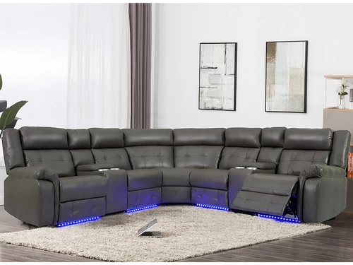 The Ketsy Dual Power Recliners Sectional comes complete with floor lighting, cup holders, and two roomy storage consoles. This set invites us to rest and relax while bringing a modern touch into your home. Material: Breathable Polyurethane.
