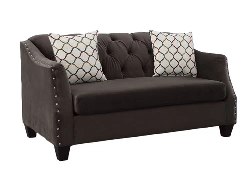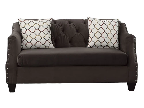 Transitional modern breakfront arm style in a lush velvet fabric. Some outstanding features include reversible bench seat cushions, tufted back, pewter nail-heads, and colorful patterned accent pillows.