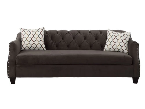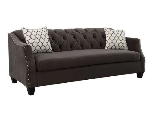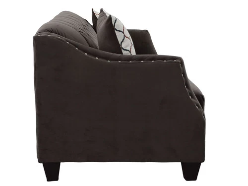 Transitional modern breakfront arm style in a lush velvet fabric. Some outstanding features include reversible bench seat cushions, tufted back, pewter nail-heads, and colorful patterned accent pillows.