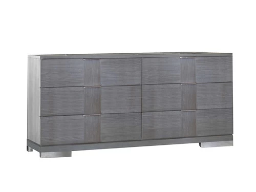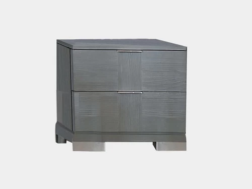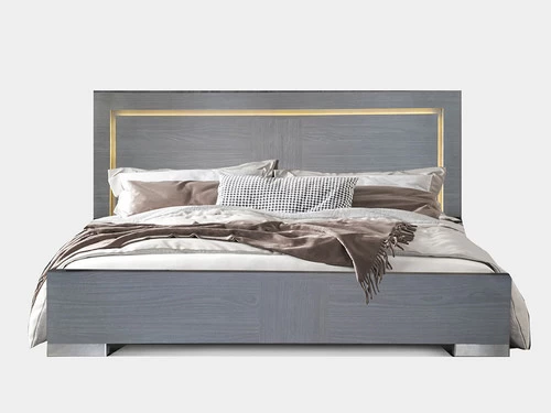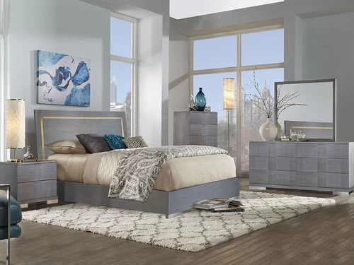 The Monaco Bedroom Collection boasts an elegant, contemporary design in a grey matte finish. Its sturdy wooden construction with French dovetail drawers, along with polished aluminum accents, adds a touch of opulence. For convenience, the nightstand includes a cup holder, while the dresser features a jewelry tray. With LED lights, this collection creates a cozy and sophisticated ambiance.