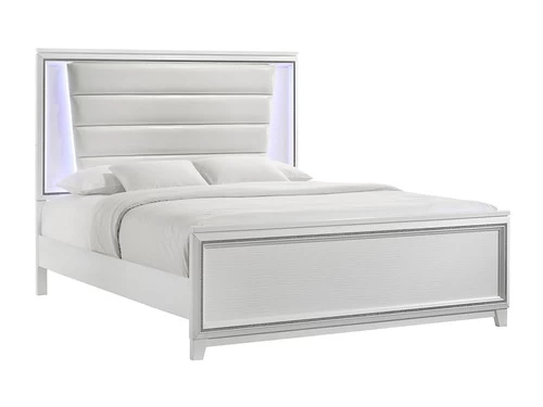 The Moondance Queen Bed is the perfect blend of modern and glamorous style. Constructed of solid and manufactured wood in a clean white finish. The panel headboard exhibits a rectangular silhouette with a chic faux leather headboard. Also includes controlled LED lighting that you can easily turn on and off. Showcases glimmering border strip accented along the bed. Assembly and a Box spring is required.