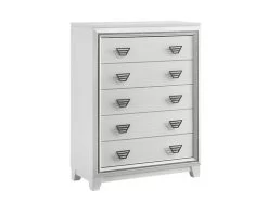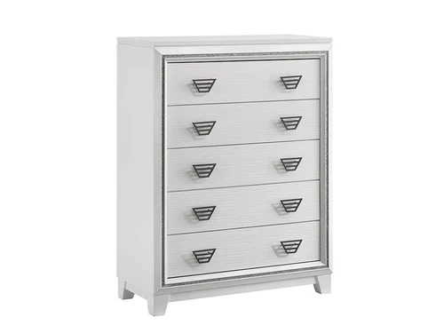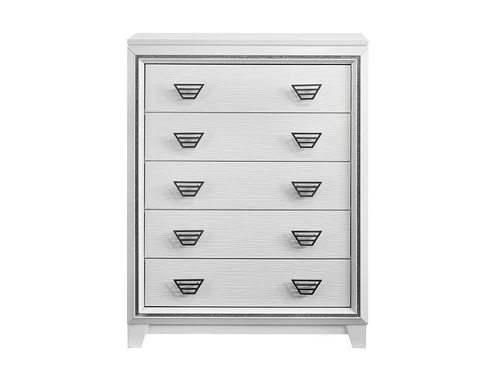 Moondance Chest serves as a great decor and functionality addition. Carefully constructed of solid and manufactured woods in a clean white finish. Has five spacious drawers that can be used to store your favorite clothing. The best part of this chest is the glimmering front. The drawers feature dust-proofing.Â