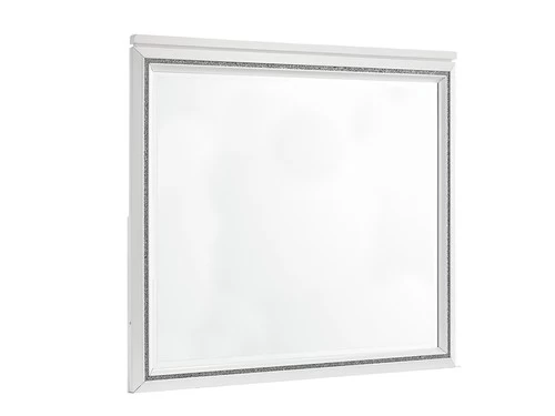The Moondance mirror is constructed of solid and manufactured wood. It features a glimmery border strip along the frame.