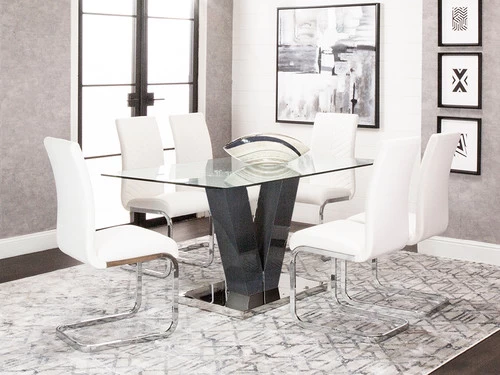The Murano collection is the perfect complement of glass, chrome, and a glossy V shaped base. Murano bring a contemporary feel to any space without compromising comfort. This beautiful collection is an ideal choice for any space, it look fantastic. The glass table and sleek, chevron stitch pattern chairs combine to create a high end and inviting look for your dining space.