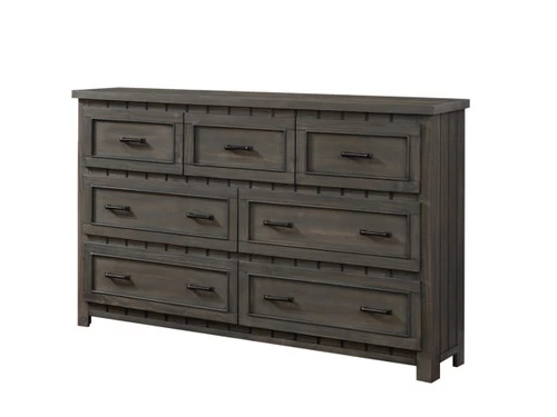 With seven spacious drawers, this dresser is fashionable and functional. Its simple, wooden frame is accentuated by eye-catching, carved embellishments. Its subdued, gunsmoke finish gives it a casual and stylish look. Sleek, metal hardware rounds out its classic design. Ideal for a child’s bedroom, this dresser offers maximum durability.