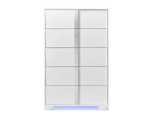 This stunning Chest boasts an ultra-modern design that combines sleek lines with elegant details. The blue LED underlighting creates a mesmerizing ambiance, while the effortless touch button power switch makes adjusting your settings a breeze. Tthe top drawers are lined with black felt to protect your delicate belongings. With vertical nickel pulls, nickel block feet, and a wire brush finish on the mirror, this Chest is truly a statement piece for your home.