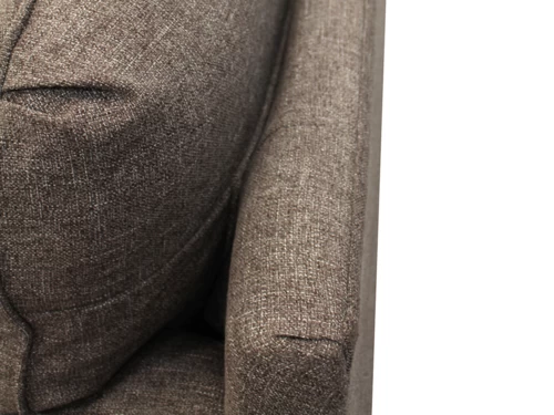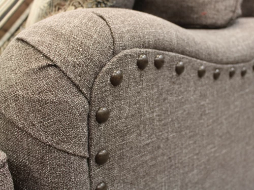 Phineas Driftwood Chair is a Traditional English Style with rustic nail head details, curved wood base, reversible seat cushions & an eclectic pillow pattern mix.