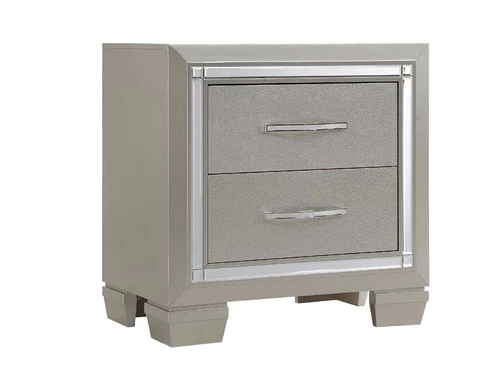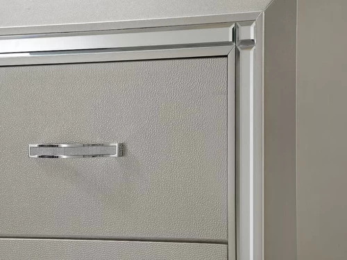 The glamorous Platinum Night Stand is dressed in a fashionable champagne finish and adorned with a chic mirror trim. Embossed drawer fronts and crystal accents in the drawer pulls complete the look.