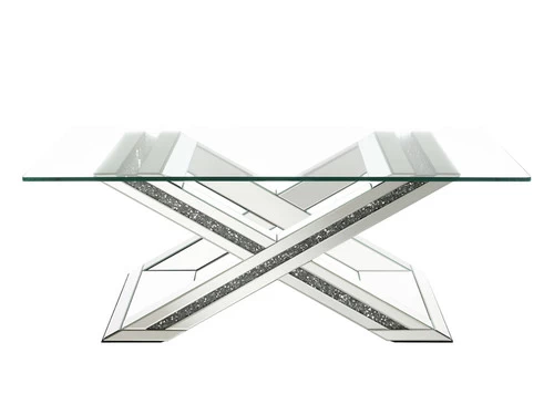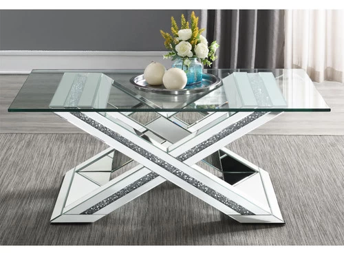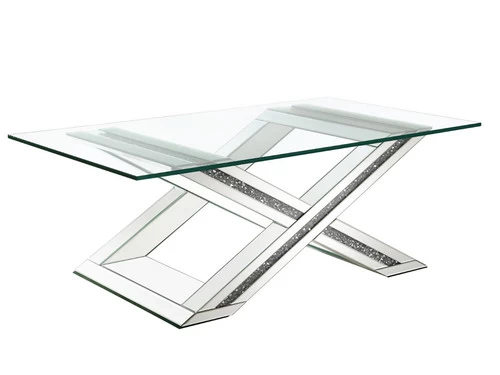 Elevate your living room with this superb modern glam coffee table. An eye-catching X-shaped pedestal base lends a chic, sophisticated expression. The flared X-shaped base is covered in a glistening mirror trim and tile, reflecting your seating and surrounding color palette. A silver crushed acrylic center glimmers from within the borders, creating a luxe look. The clear glass top is spacious enough for showcasing centerpieces and placing refreshment trays and snacks when hosting visitors.