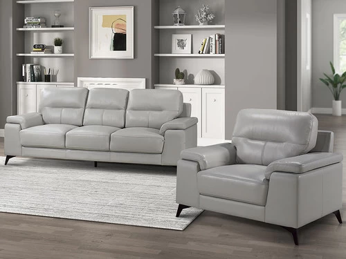 This set is modernly detailed with clean lines and bold arms, as well as slim legs. Styled for the modern home, the sofa set blends the luxurious feel of leather with the comfort of plush seating. The top grain leather cover, with faux leather, enhances the sleek profile of the collection. Contoured pillow-top arms and black metal legs further enhance the modern stance. Relaxation is important and on this sofa set you will feel very comfortable.