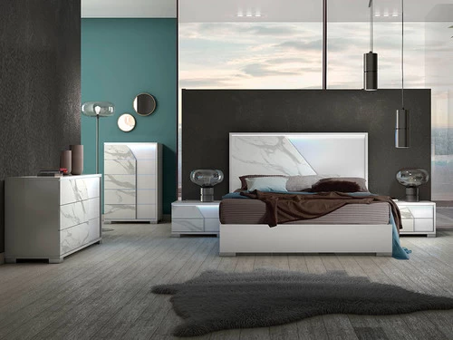 This uniquely designed bedroom collection showcases a trend setting design with unique creativity. The high gloss white lacquer is teamed with a soft faux marble design which casts interest to the interior. The Sofia set includes a matching dresser with an optional slim framed mirror illuminated by an LED light, 5 drawer chest and matching nightstands. The simplistic headboard also features an LED light which highlights the lustrous marble effect. Using distinctive materials on the drawer fronts of each unit, Fabelli has created a handle less appearance, drawing attention to this minimalistic look. Each unit is situated on bright chrome feet which compliments the grey hues in the faux marble.