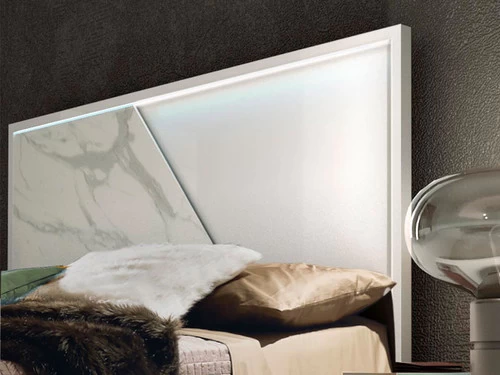 This uniquely designed bed showcases a trend setting design with unique creativity. The high gloss white lacquer is teamed with a soft faux marble design which casts interest to the interior. The simplistic headboard also features an LED light which highlights the lustrous marble effect. The Bed is situated on bright chrome feet which compliments the grey hues in the faux marble.