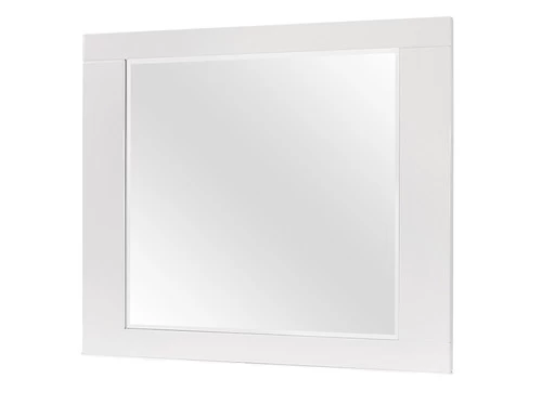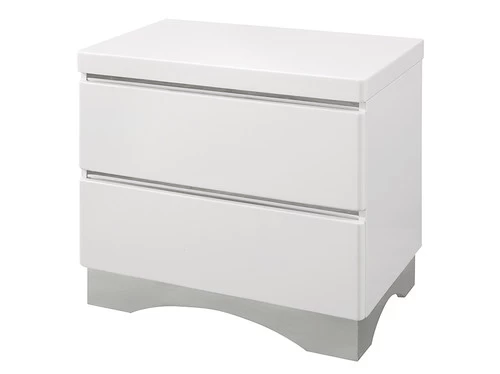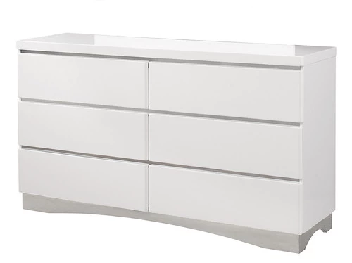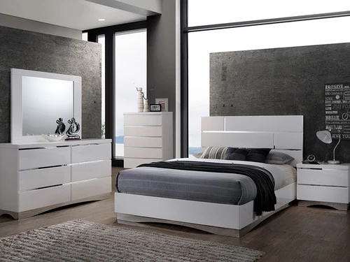 High gloss finish in white color, full extension drawer glides, felt lined drawer tops, dust proofing tops, beveled mirror glass, euro slats, only mattress needed no boxspring required, shaped bases on bed, and case goods, mirrored accenting throughout the base.