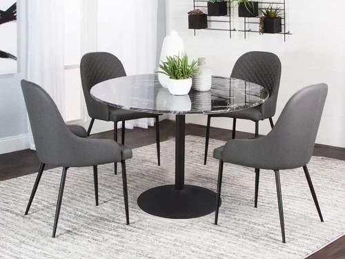 Targa allows you to create a comfortable stylish space with this marble glass dining set. This table features a matte black pedestal base with a mid century modern chair design. The Targa will make a statement in any dining space. The round glass top allows for an open spacious feel.